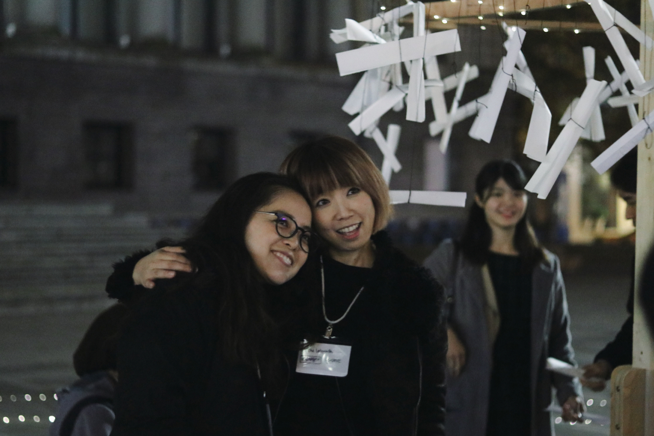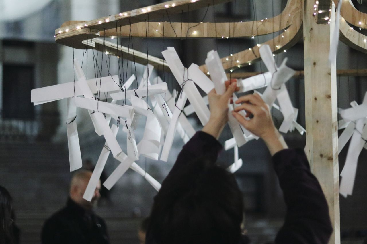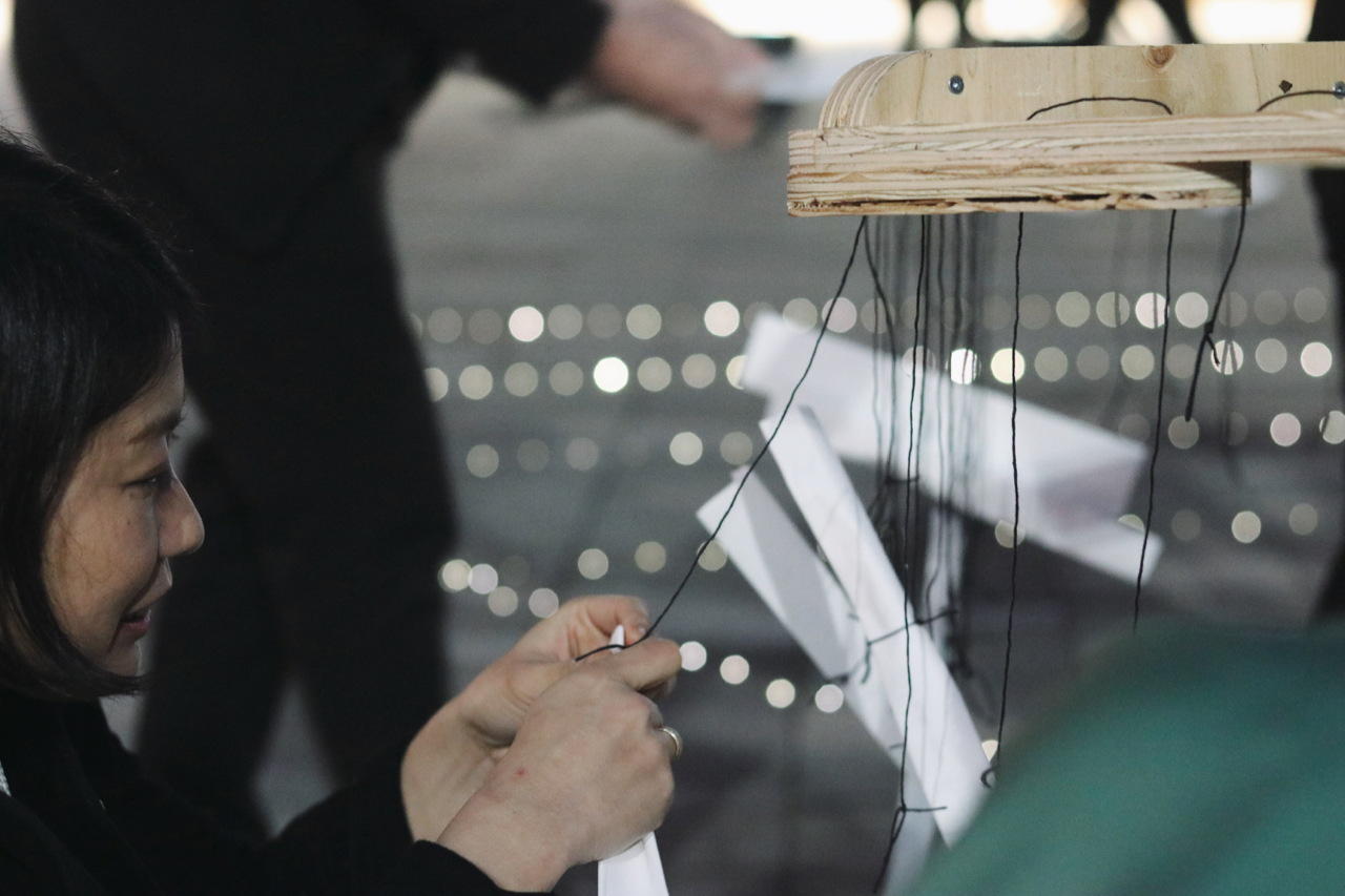 The Labyrinth of Hidden Messages was a 17 meter labyrinth made out of LED lights. At the centre of the labyrinth was a sculptural wooden structure called the Tree of Hope. Passersby were invited to walk the labyrinth, which would bring them to the centre where they would write a message of hope to the future. The message was hung on the Tree of Hope. Participants then continued around the labyrinth which eventually brought them back to the other side of the tree, where they received a message of hope in return, it was theirs to take with them.